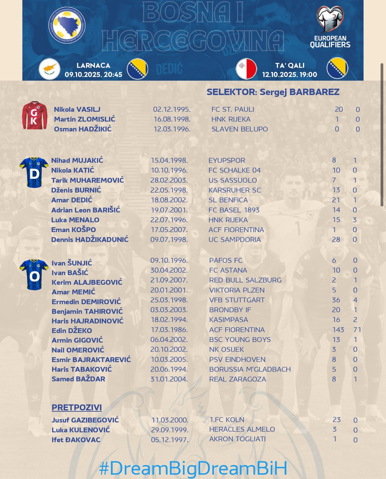 Sa velikim optimizmom dočekujemo ovo okupljanje i vjerujem da ćemo nastaviti naš put na način na koji svi priželjkujemo – borbeno, zajednički i sa jasnim ciljem pred sobom. Želimo da kroz ove dvije utakmice pokažemo napredak i pravi timski duh. Bodovi sa Kipra bi nam mnogo značili za nastavak kvalifikacija, ali nećemo zanemariti ni meč sa Maltom koji nam je bitan u pripremi ekipe za buduće izazove. U reprezentaciju se vraćaju tri igrača – Denis Hadžikadunić, Haris Tabaković i Luka Menalo. Siguran sam da ćemo svi dati svoj maksimum i da ćemo zajedno napraviti nove korake ka ostvarenju naših ciljeva.