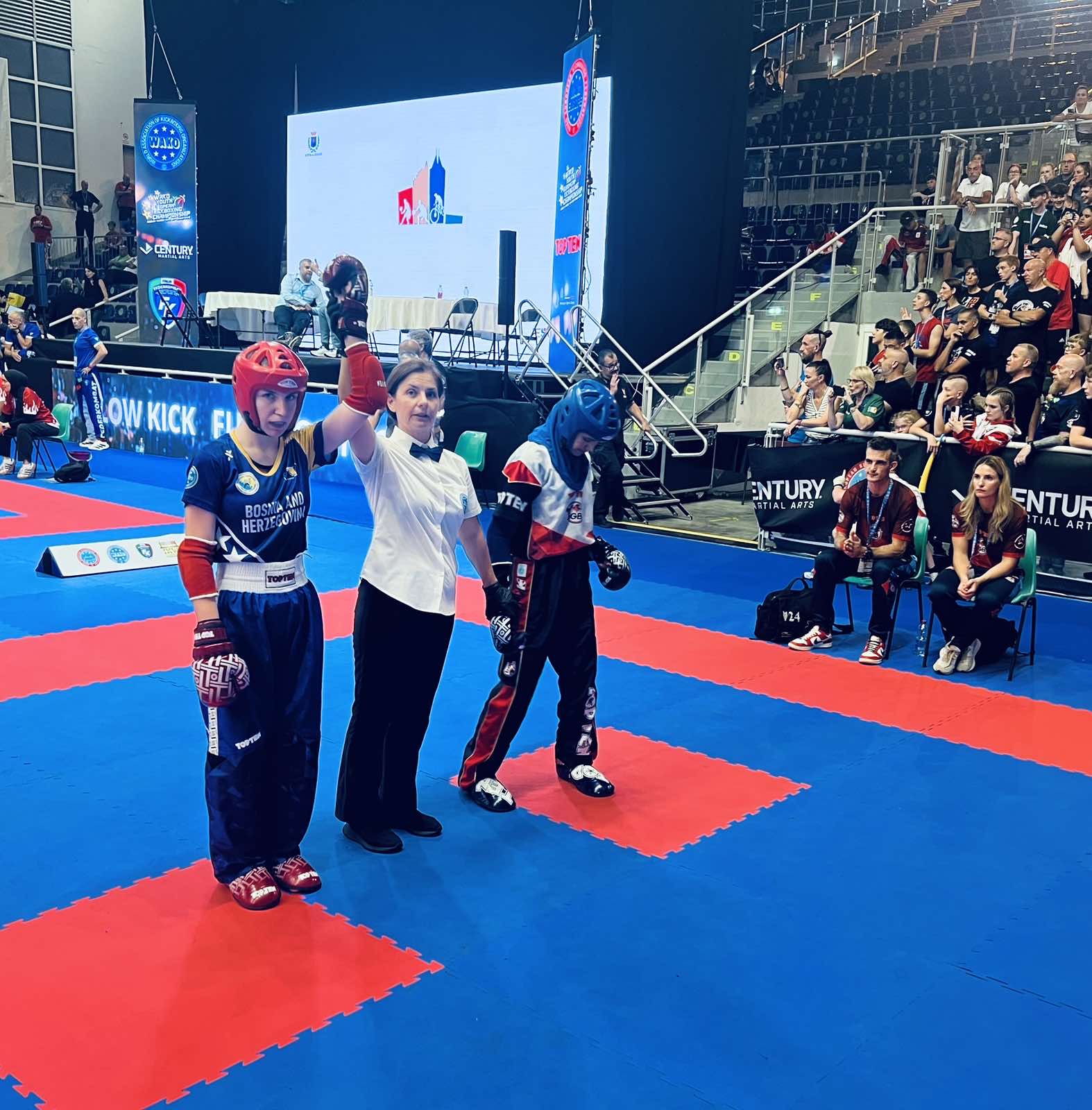 Ines Ćatić, juniorka u disciplini Point fighting -55 kg, žrijebom je prošla prvi krug, a zatim ubjedljivo savladala predstavnicu Velike Britanije. U borbi za medalju čeka je dvoboj protiv višestruke svjetske prvakinje iz Njemačke.