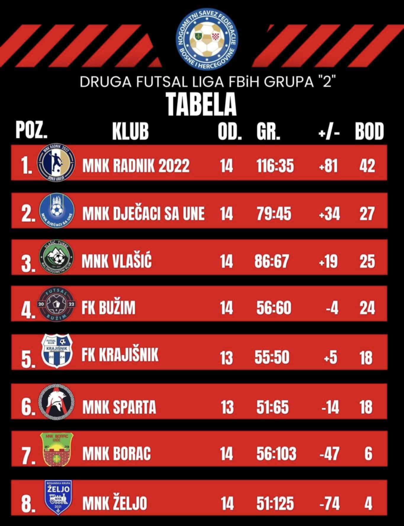 MNK Dječaci sa Une uspješno su priveli kraju još jednu sezonu, iza koje ostaje rezultat vrijedan svakog poštovanja – osvojeno drugo mjesto u Drugoj futsal ligi Federacije BiH, grupa Zapad.