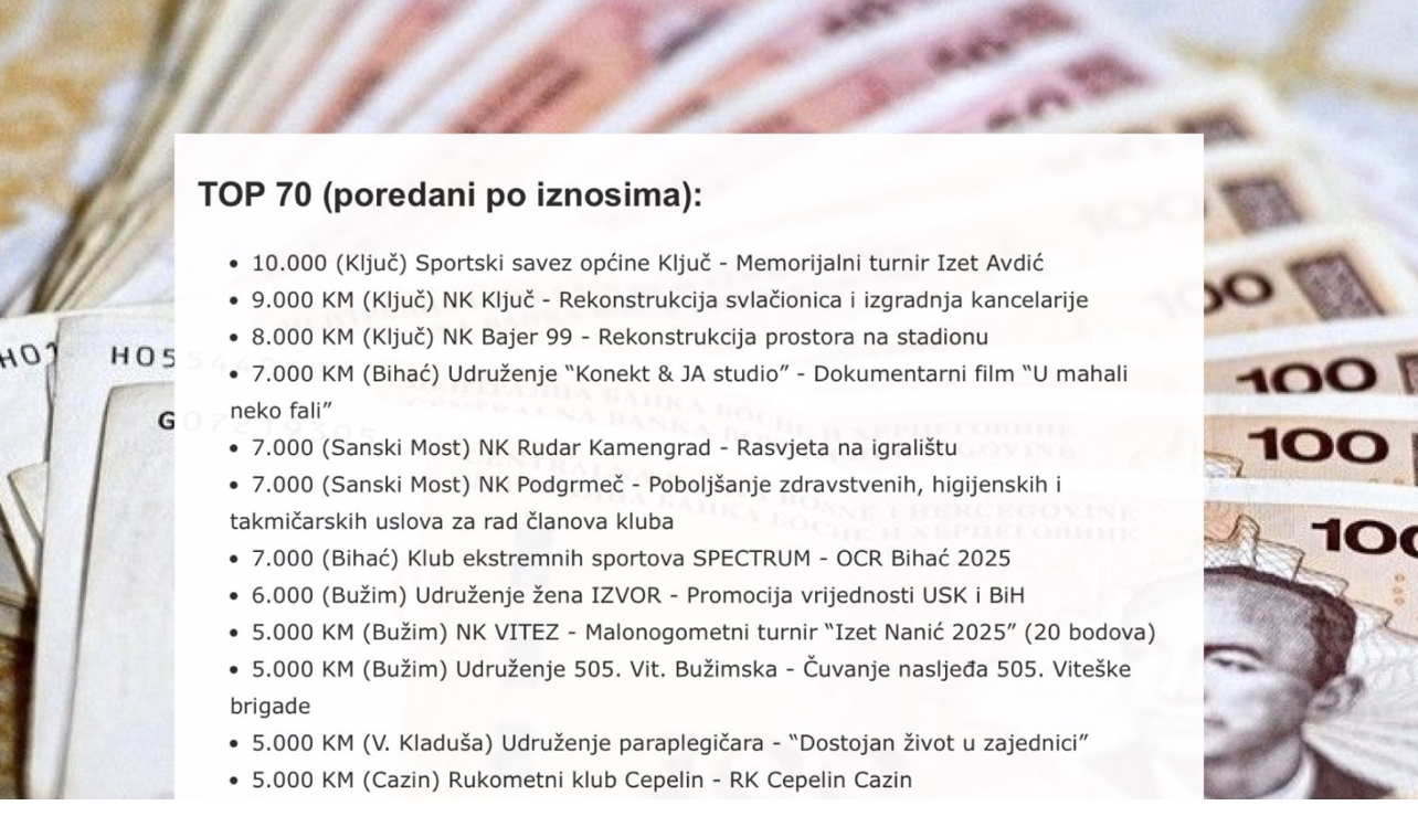 Donosimo pregled TOP 70 organizacija koje su dobile najveće iznose, od 3.000 do 10.000 KM. Preostalih 140 organizacija dobilo je podršku u iznosima od 1.000 do 2.000 KM.